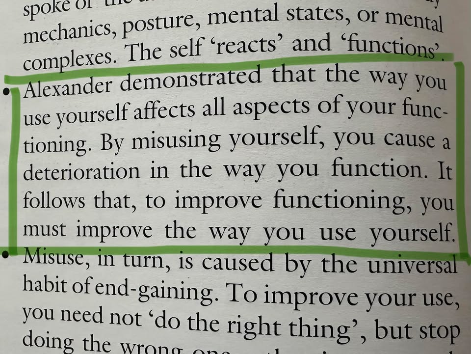 This read is medicine to my system. An excerpt that gets straight to the point what the Alexander Technique does for everyone: This is where the Alexander Technique begins. We are not imposing a new coordination. We are reactivating responsiveness. When we work with Primary Control — the relationship between head, neck, and back — we are working with the same organising system the baby was developing in the crib. When we invite inhibition — the pause before automatic reaction — we are giving the nervous system a chance to sense again. When we offer direction, we are not imposing positions. We are inviting the system back into its own capacity to organise.